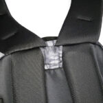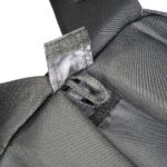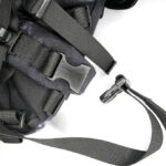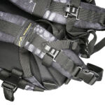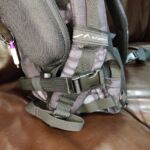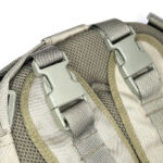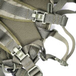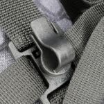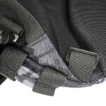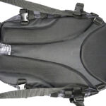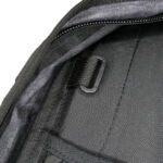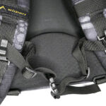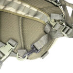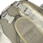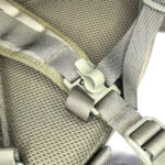 In the case of the sparrow 20, the shoulder straps are much more substantial, wider, and padded. The tops of the straps are fixed, but the bottom have quick release buckles to give you a quick exit from the straps when needed. Under the straps at the top of the back panel is the hydration tube port. The back panel has large padded contours and space for air to flow. At the bottom end of the shoulder straps there is an angled load spreader where it is fixed to the bag. Next to this, on either side, is a webbing attachment point that could be used for fitting a waist strap.